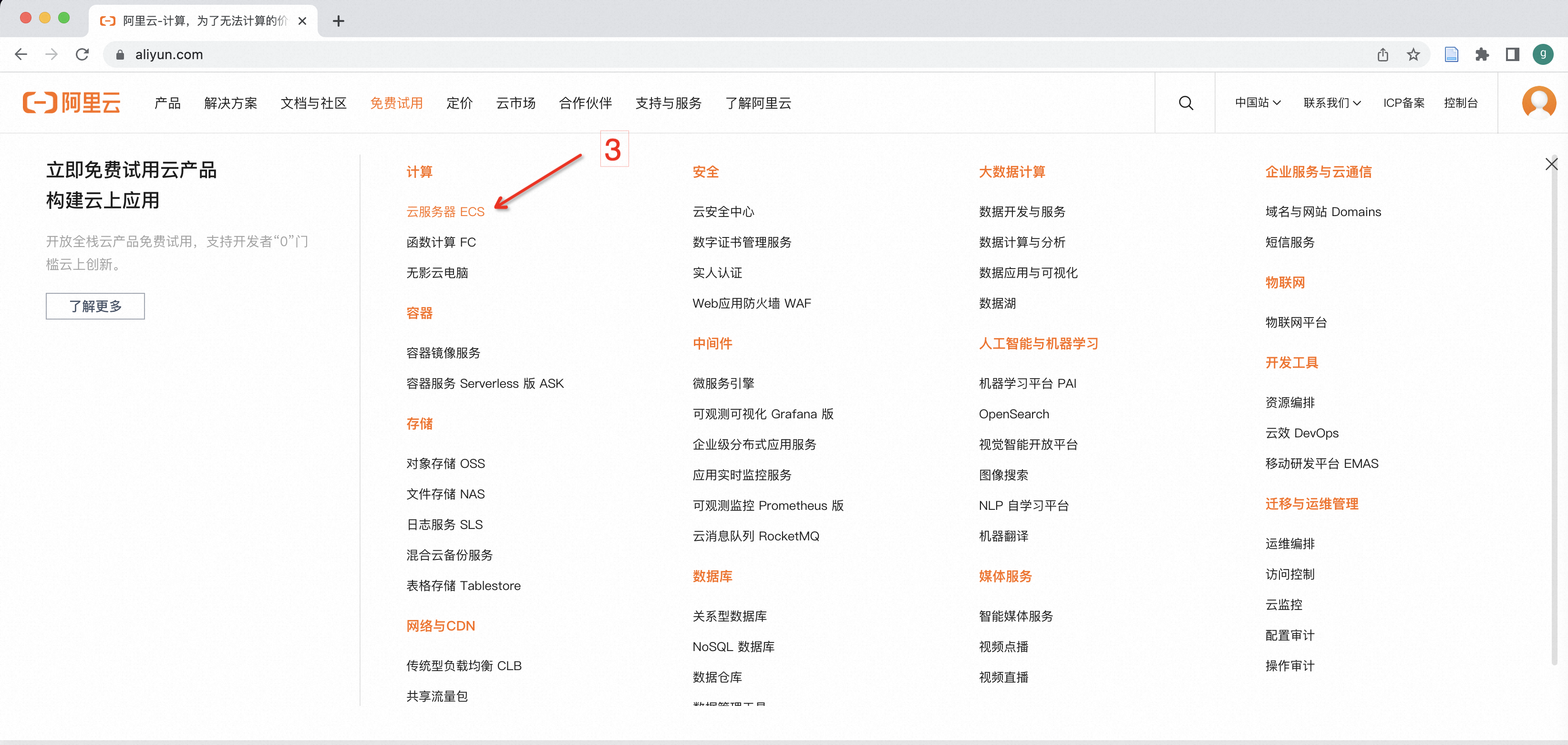 打开阿里云官网点此链接,注册并登陆个人账号,如下图标号1所示