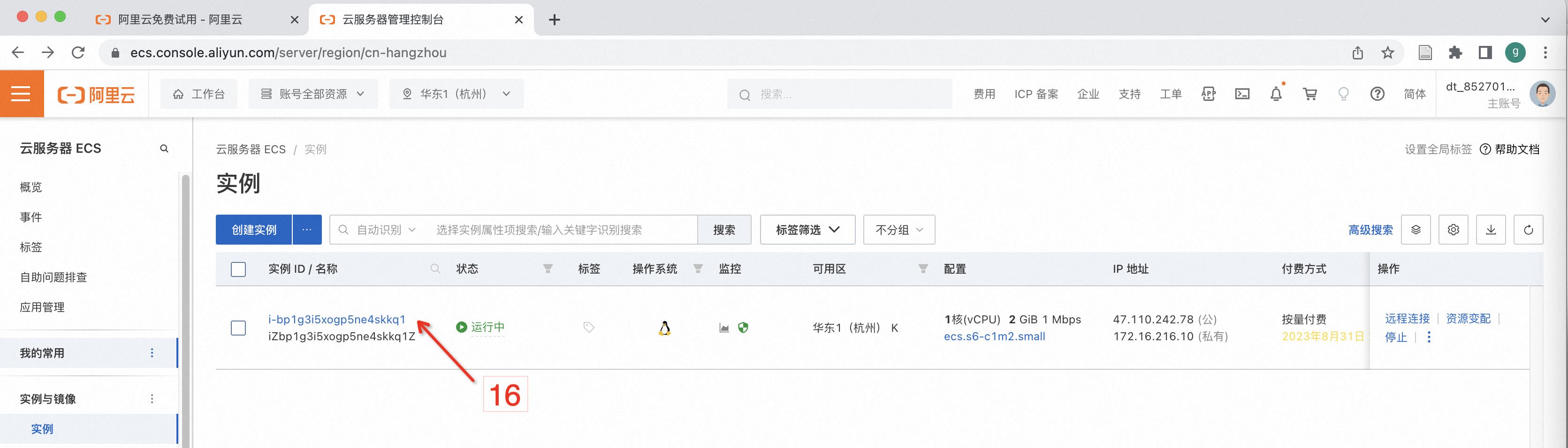 个人账号可以免费试用1核2GB内存,每月750小时,企业认证后,可以免费试用2核8GB内存 3个月,根据账号情况,点击上图中标号4,出现如下界面: