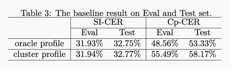 基线系统的结果如表3所示。在训练期间,说话人档案采用了真实说话人嵌入。然而由于在评估过程中缺乏真实说话人标签,因此使用了由额外的谱聚类提供的说话人特征。同时我们还提供了在评估和测试集上使用真实说话人档案的结果,以显示说话人档案准确性的影响。