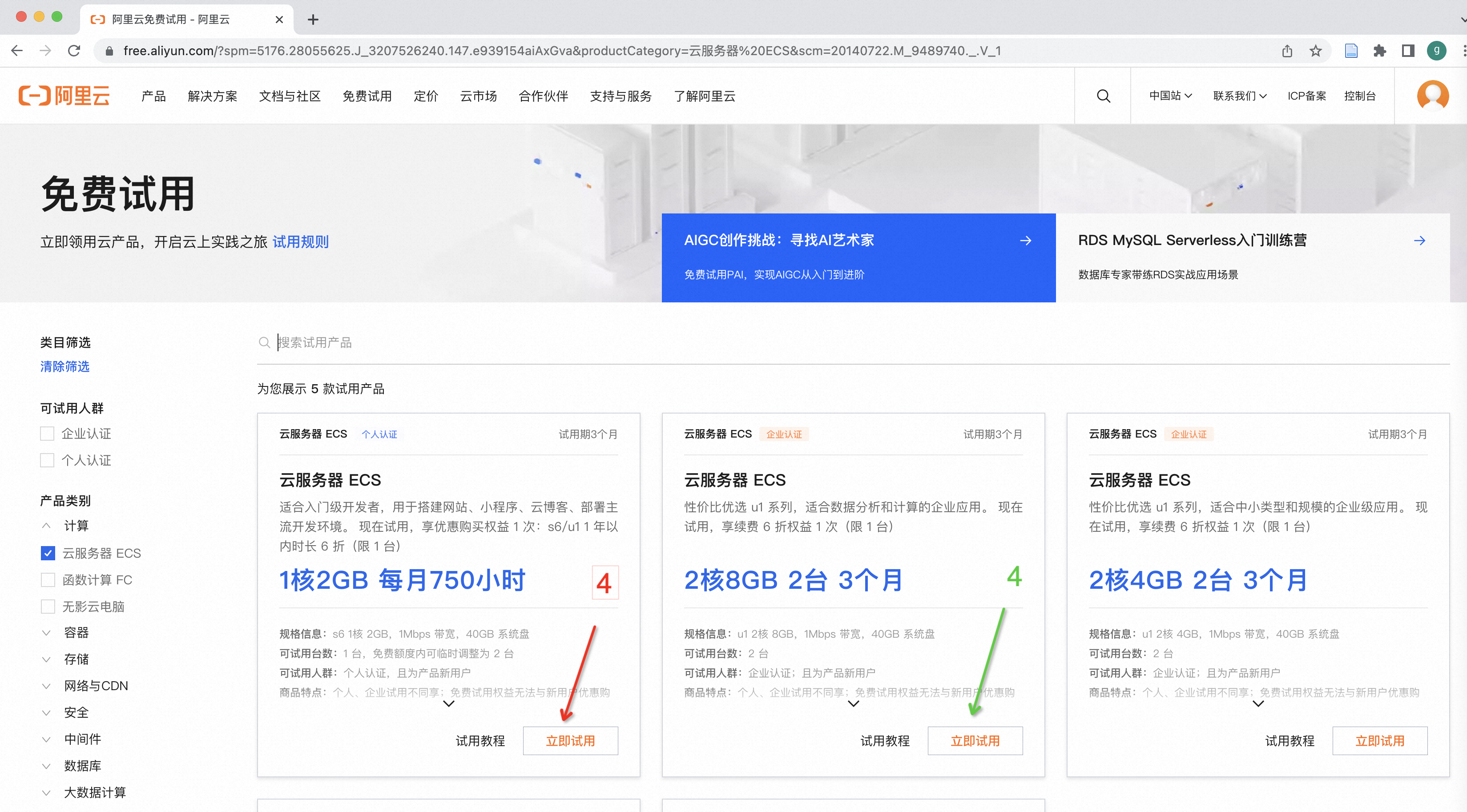 个人账号可以免费试用1核2GB内存,每月750小时,企业认证后,可以免费试用2核8GB内存 3个月,根据账号情况,点击上图中标号4,出现如下界面: