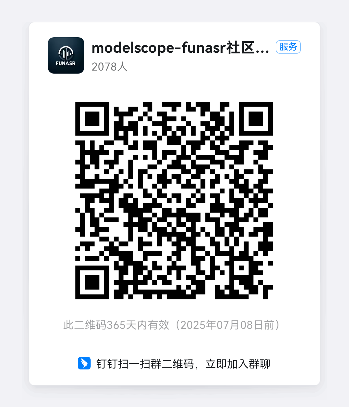 使用中に問題が発生した場合は、githubページで直接Issuesを提起できます。音声に興味のある方は、以下のDingTalkグループQRコードをスキャンしてコミュニティグループに参加し、交流と議論を行ってください。