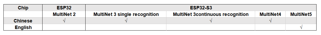 The following table shows the model support of Espressif SoCs: