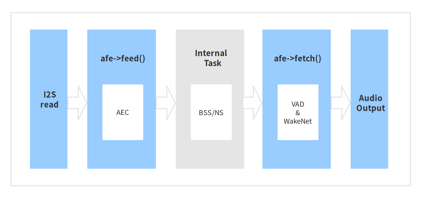 After initializing AFE and WakeNet, users need to input audio data into AFE by afe_handle->feed() function for processing.
